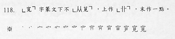 - 「宀」是房屋。篆文像屋子側面有頂有牆的形狀。象形。