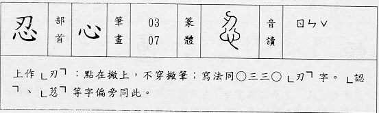 - 必忘忌志忍忠忽念忿怒忝恭慕忙忖忱快怏