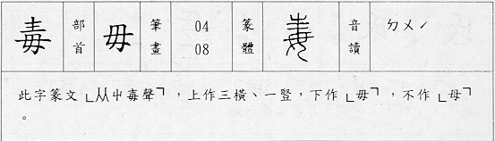 - 「毋」是禁止之詞。女女,一是禁止的符號,不使有姦,指事。現行部首與「母」有關之字多收入此部。「母」的意思就是母親,篆文作