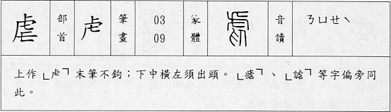 「虍」就是虎頭。金文虎字作,上半像虎頭,下半像其身、足、尾,篆文只取其頭部。象形。