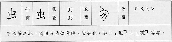 - 「虫」就是蛇。篆文像一條蜷曲的長蟲。象形。古人多借虫為蟲,故鱗介、昆蟲 、爬蟲等類的字多
