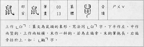 - 「鼠」是老鼠,篆文上像老鼠張嘴露齒之形,下像兩足及長尾形。象形。